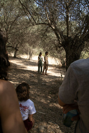 Sirens (or False Promises) is a performance directed by Kris Adem. It is a collaborative performance where the audience was lured into the woods with false promises of special cocktails and free alcohol only to find themselves in an olive orchard waiting. The performance climaxes with war siren like call and response coming from various directions produced by almost all the resident artists.